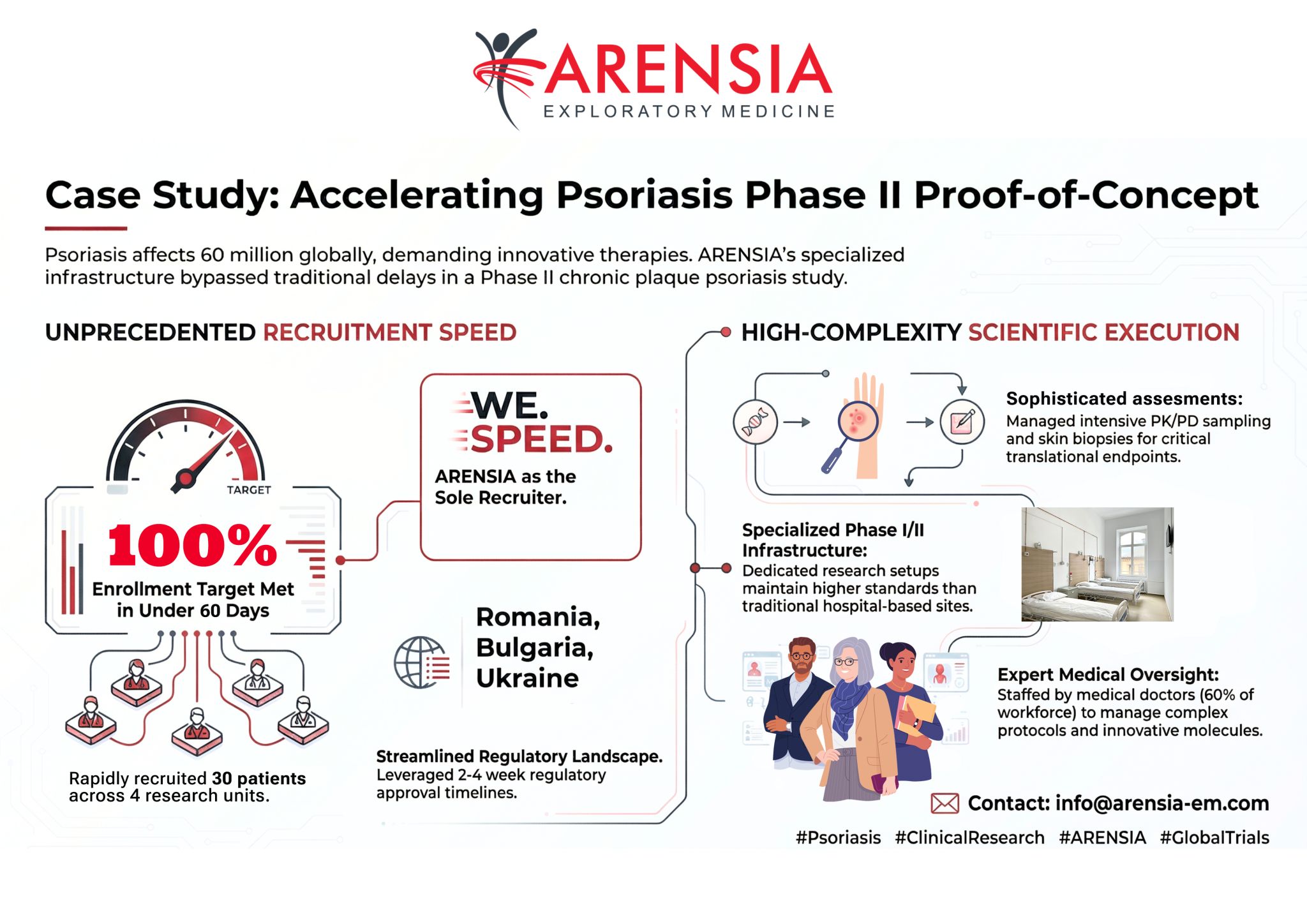 In a recent Phase II study in moderate-to-severe chronic plaque psoriasis, four ARENSIA research units across Romania, Bulgaria, and Ukraine completed recruitment for the entire Protocol, enrolling all 30 patients in under two months, with ARENSIA as the sole contributor.